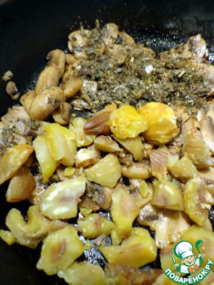 Шампиньоны нарезать пластинками, чеснок мелко порубить. Каштаны у меня уже отваренные и очищенные. Вот здесь подробнее про процесс. http://www.povarenok .ru/recipes/show/692 24/