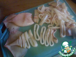 Кальмаров сполоснуть под холодной водой, выпотрошить (сверху пленку не снимать).