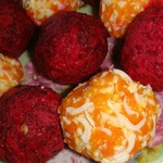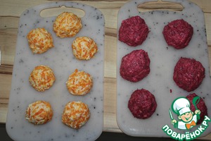 - Яйцо куриное (вареные, 4 белка для морковных шариков, 4 желтка для свекольных шариков) — 4 шт