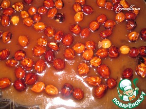 Сахар (100 гр.) растопить на слабом огне, добавить орехи (фундук 100 гр.) и, помешивая, довести до золотистого цвета сахара. Массу выложить на смазанный маслом противень и после охлаждения и затвердения измельчить в блендере так, чтобы остались небольшие кусочки (оставить немного пралине для посыпки сверху).