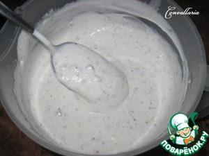 Постепенно добавить сахар (100 гр.), измельченные грецкие орехи (150 гр.) и муку (2 ст. л.).