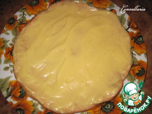 На первый корж нанести заварной крем.