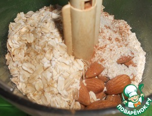 В блендер отправляем миндаль, овсяные хлопья, масло (лучше кокосовое, но если такого нет, тогда оливковое), корицу и щепотку соли. Все смолоть в муку. -