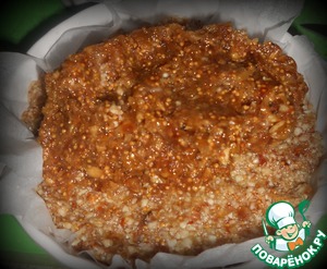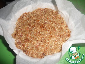 Отставить в сторону 3/4 стакана теста, все остальное тесто распределить по форме, в которой будет находиться пирожное. Я делала в 2 круглых формочках; если делаю много пирожных, использую квадратную стеклянную форму. На дно кладу бумагу для выпечки.