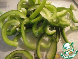Тоже обжарить до золотистого цвета на растительном масле и выложить шумовкой к перцу.