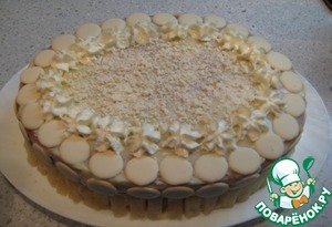 Накрыть второй половиной, выложить вторую половину крема и выровнять бока и верх. Бока украсить нарезанными из колечек полосками ананаса.