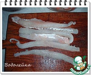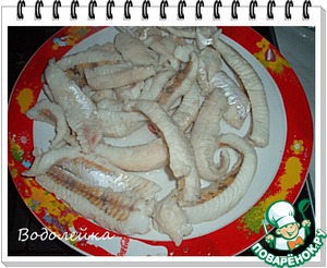 Готовое рыбное филе разрезаем на полоски по длине (как на фото). Готовыe рыбные кусочки пока поставить в холодильник. -