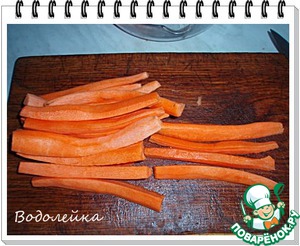 Морковь очистить. И порезать брусочками по ее длине (аналогично рыбе).