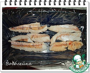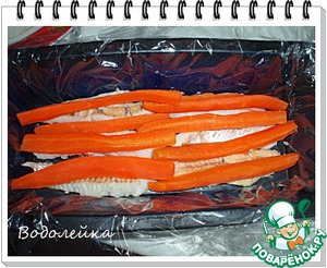 Выкладываем, чередуя, полоски рыбы... -
