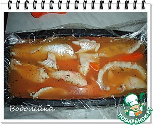 У меня получилось два слоя рыбы и два слоя моркови. -