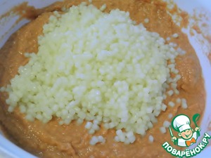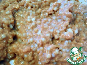 Осталось совсем немного. В полученную массу высыпаем сваренное саго и добавляем томатную пасту. Солим-перчим по вкусу и хорошо перемешиваем.