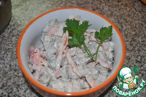 Вс выше перечисленные ингредиенты перемешать и заправить майонезом. Поставить в холодильник и дать пропитаться не менее 1 часа. Приятного аппетита!!!