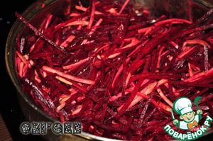 Почистить свеклу и репку. Нашинковать тонкой соломкой. Я воспользовалась "тёркой бёрнера" с насадкой "мелкая соломка". На сковороде нагреть масло. Выложить овощи и жарить без крышки, время от времени перемешивая. Масла не жалейте, когда его мало, овощи жарятся плохо.