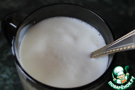 Кефир немного подогреть, добавить соду, перемешать, вылить в яичную смесь.