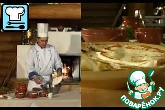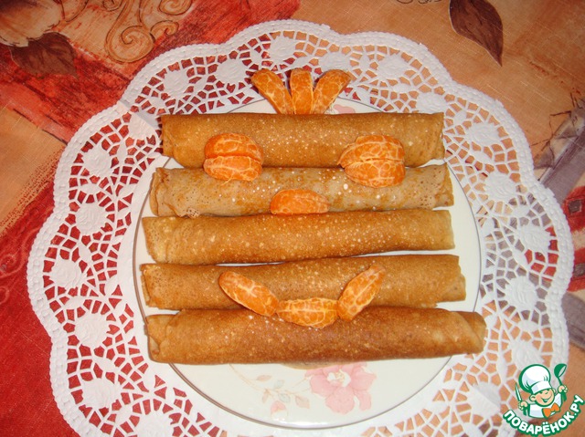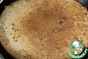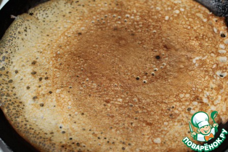 Выпекаем блинчики, как можно тоньше наливая тесто на раскалённую сковороду.