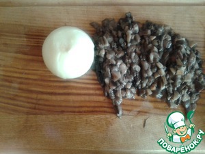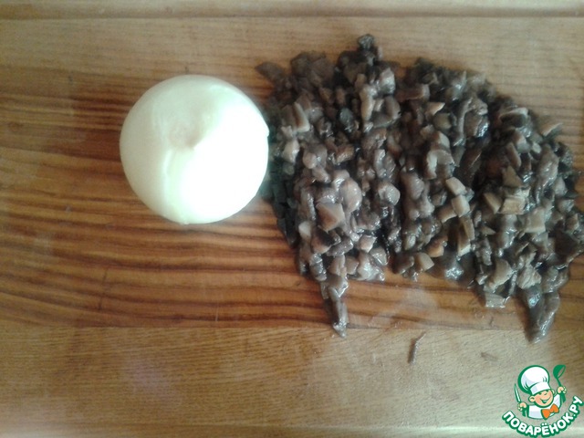 Для начала мелко режем грибы и лук, затем обжариваем и оставляем остывать.