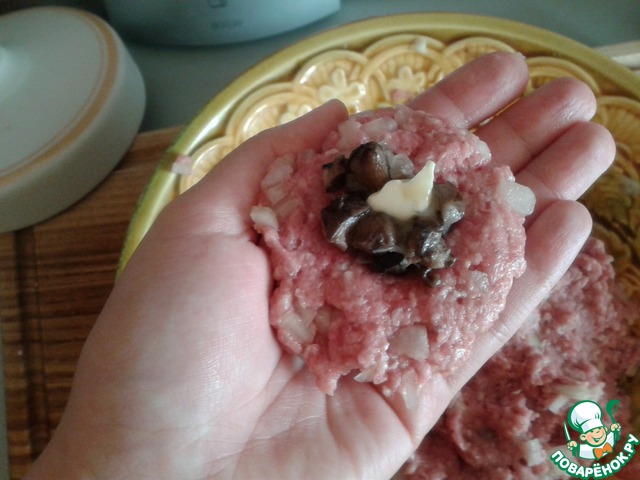 Дальше формируем наши котлетки. Для этого на ладони распределяем фарш так, чтобы получилась лепешка. В ее центре делаем небольшое углубление и кладем туда 1 чайную ложку наших поджаренных грибов. Сверху на грибы выкладываем кусочек сливочного масла. Все это накрываем еще одной лепешкой фарша и формируем котлетку.