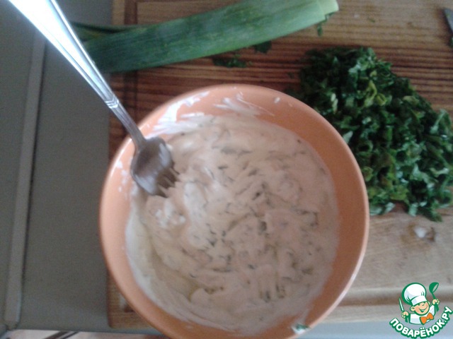 Чтобы котлетки получились попикантнее, я делаю к ним соус. В принципе, это обычный соус "Тузлук". Смешиваем сметану, зелень (лучше петрушку), немного чеснока и перца. Все, соус готов. Но если желания возиться с соусом нет, можно просто полить котлетки сметаной. Тоже очень вкусно.