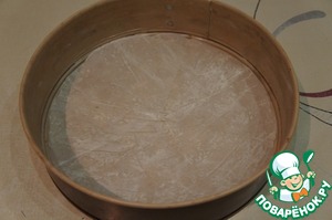 Тесто раскатать до толщины 4 мм (я обычно слегка раскатываю тесто, а потом просто разминаю его руками). Выложить им дно и стенки формы диаметром 24 см.