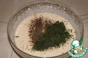 Смешать миксером на самой маленькой скорости все компоненты, взбивать не надо. Добавить соль, перец и зелень по вкусу.