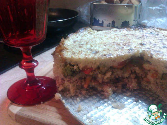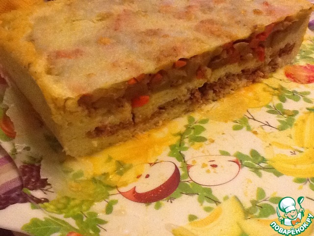 Меня заинтересовал этот рецепт тем, что это и мясное блюдо, и гарнир одновременно. Может, пригодится и вам такой пирог?