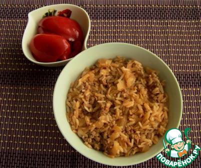 Под конец добавляем прокрученное вареное мясо сверху. Мешаем чуть позже (чтобы блюдо не пригорело). Доводим до готовности риса под крышкой на медленном огне. Если рис еще сыроват, а воды маловато, добавить чуть водички.