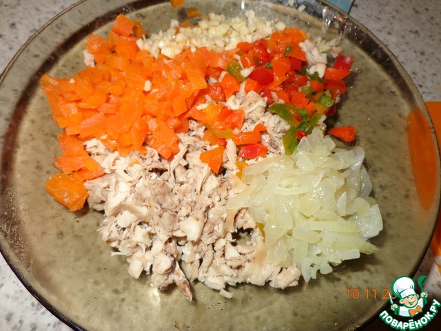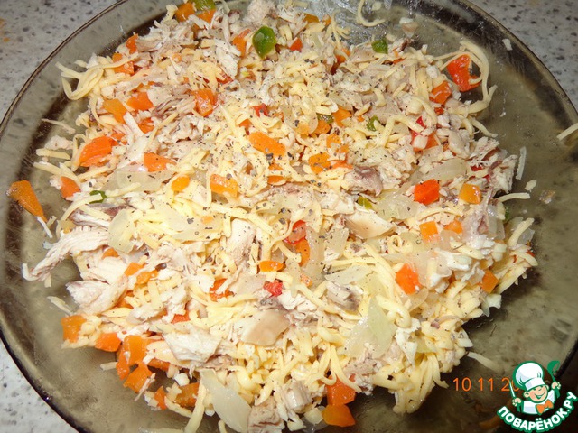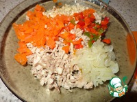 Нарезаем мелко наше куриное филе, морковь, болгарский перец (у меня замороженный), чеснок. Все перемешиваем, добавляем лук, и натертый на мелкой терке сыр.