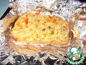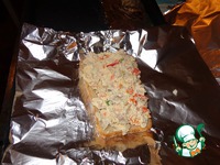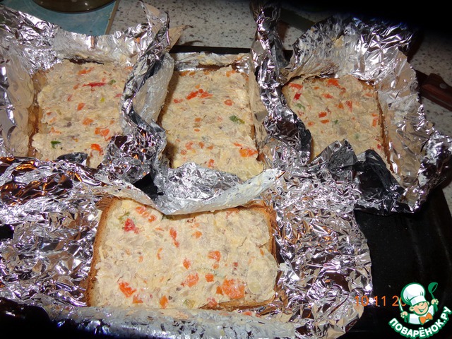 Собираем бутерброды: Я сразу нарезаю фольгу на квадраты, кладу на нее ломтик хлеба (хлеб любой, какой есть в доме, можно даже подсохший позавчерашний). Накладываем нашу начинку и заворачиваем.