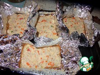 в фольгу укладывать не стала, знаю, что из=за влаги хлеб стал бы мокрый, а после остывания тянулся бы как резина. Предпочла хрустящие сухарики.