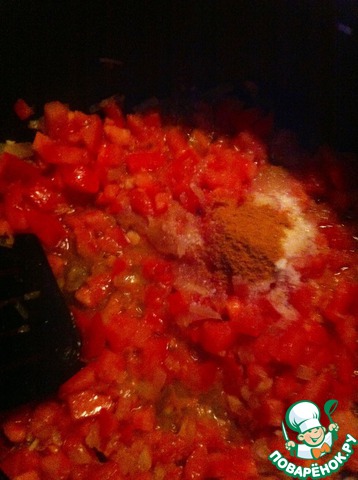 Обжарить подготовленные овощи на среднем огне, затем влить к ним подготовленные помидоры. Добавить соль, сахар и чёрный перец по вкусу, перемешать и прогреть минут 5-10.