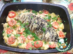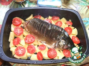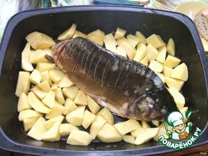 Выкладываем в форму рыбку ( заранее можно порезать на порционные куски ). Вокруг рыбки ложим картошку.