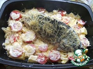 Всё ОБИЛЬНО смазать майонезом ( и рыбку тоже ), и посыпать тёртым сыром.