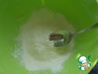 Соединить разрыхлитель с просеянной мукой. В перетертую массу добавляем 1/2 часть муки и вымешиаем.