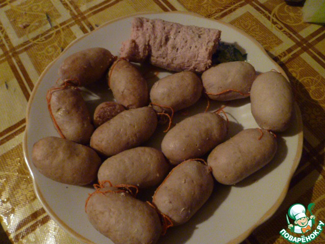 После каждой следующей сосиски (каждые 15 см) стягивайте нитками границы оболочки. Узелком завяжите