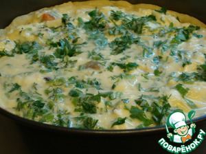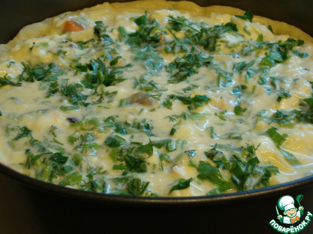 В форму для выпечки с подсушенным коржом выложить тыкву с грибами. Посыпать зеленью