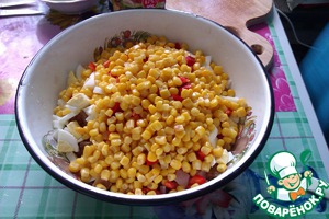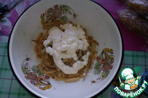 И натертый на терке сыр, сверху еще полить немного майонезом. Перемешиваем.