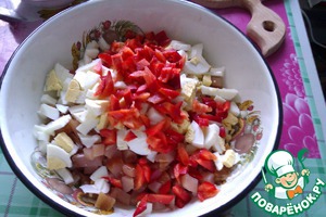 Режем филе, яйца, перец кубиками и добавляем к сухарикам.