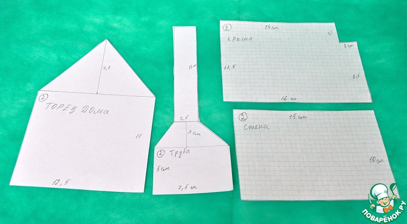 Вначале я сделала детали для большой части дома. Так как размеры на фото плохо видны, опишу каждую. Под номером 1 все детали для большей части дома, заметьте, что каждой детали нам понадобится по две (две стены, два торца, два ската крыши).