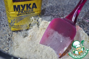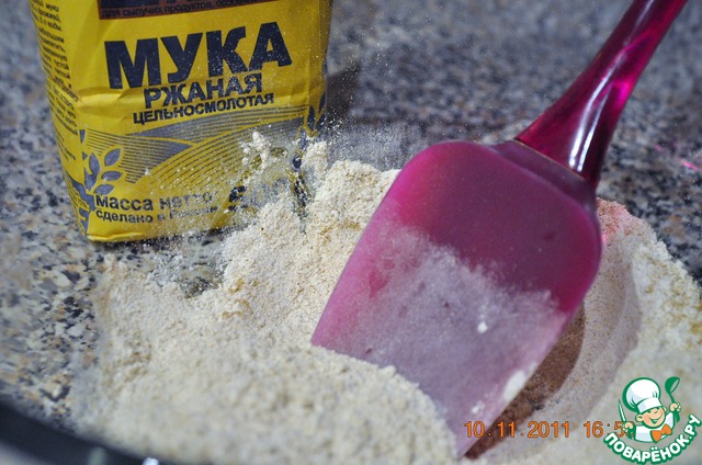 Добавляю к пряностям ржаную муку, соль и стакан белой муки и перемешиваю.