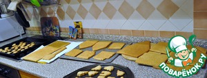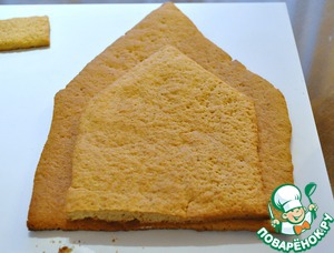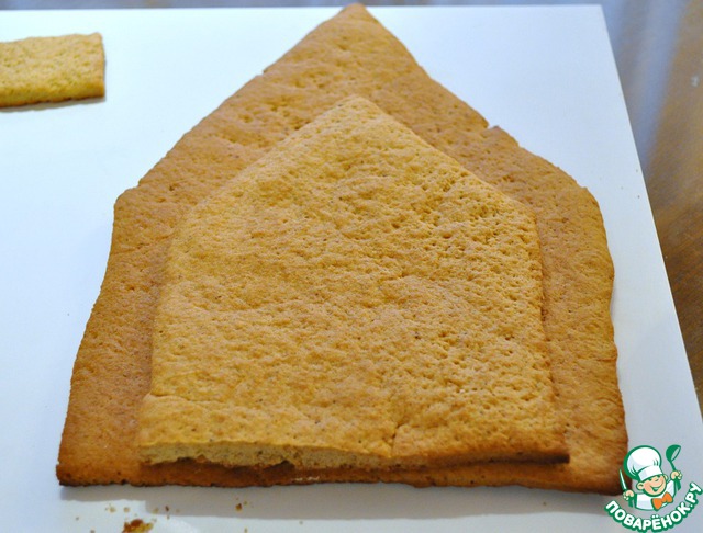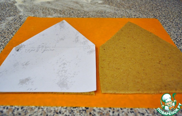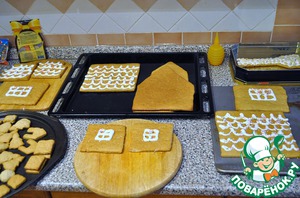 Следите, чтобы толщина была одинаковая - примерно 0,5 см. Особенно крыша, если она будет толстая, то получится очень тяжелой. После того, как переложите детали на лист, подправьте их по шаблонам, они могли деформироваться. Выпекаю минут по 12-15.