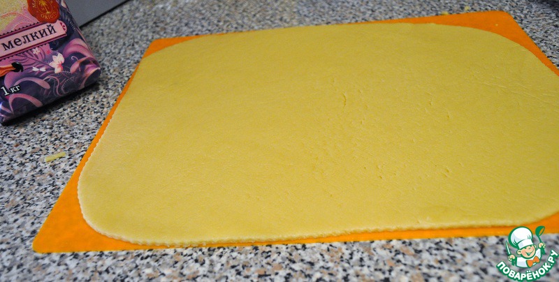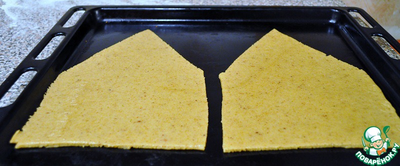 Раскатываем корж из белого теста максимального размера, прокалываем вилкой, чтобы не вздувался, и выпекаем 15 минут при 180 градусах.