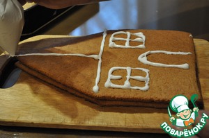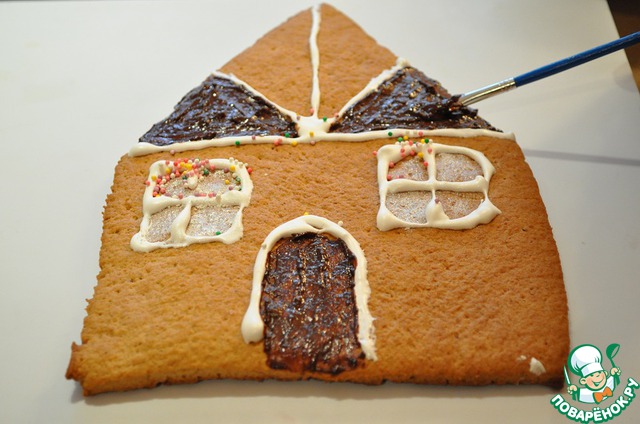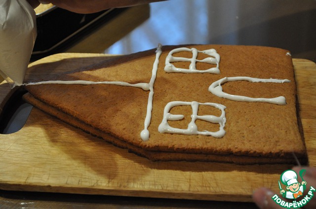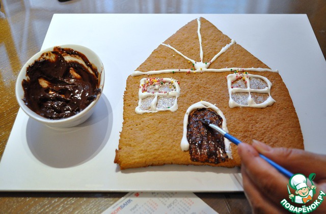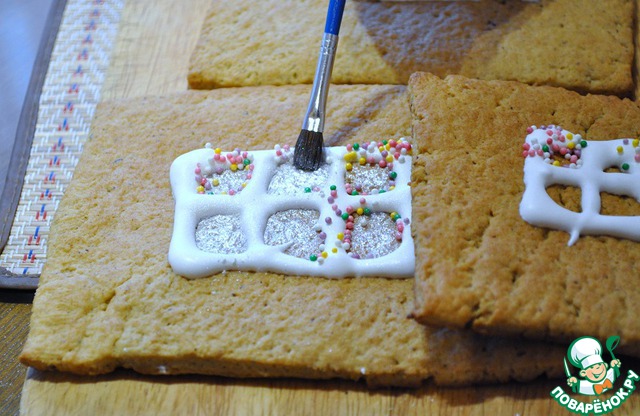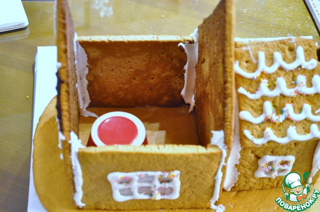 Взбиваю вторую партию глазури из 2 белков, 120 гр. сахара и 10 капель лимонного сока и начинаю собирать дом. Все детали клею на глазурь, изнутри стены дома можно подпереть стаканом, пока не схватятся.