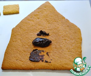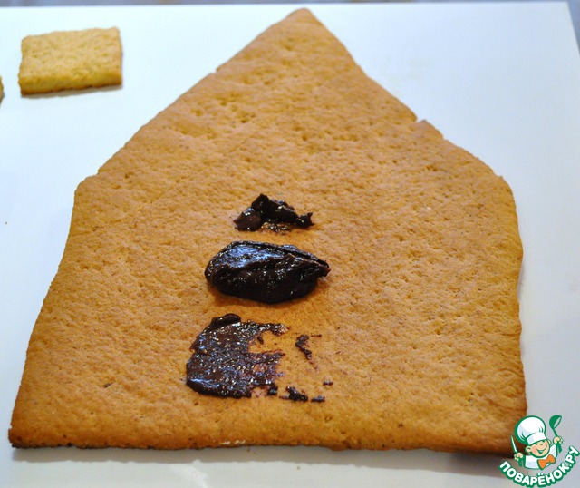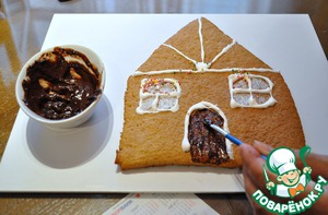 Остатками шоколада приклеиваю торец маленького дома к большому.