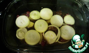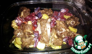 Итак. Я собрал всё мясо и картофель в ёмкость для запекания, была докуплена ещё мякоть баранины.