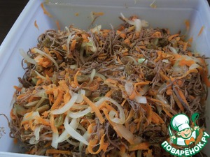 Теперь отвечаю. Мясо 500 г сырого, именно говядину ( телятину) смотри, чтобы были видны волокна - потом легче разделывать. Маринад добавляем в воду, где лежат овощи, ничего не сливаем - это потом отжимаем овощи от жидкости.