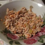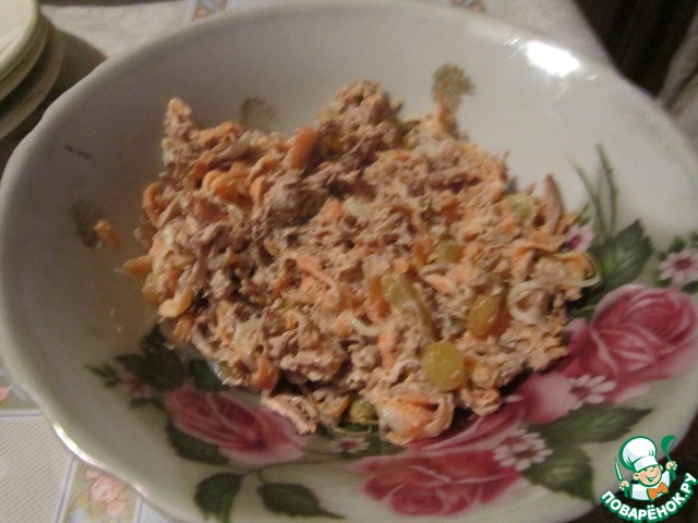 Овощи с изюмом хорошо отжимаем от маринада и соединяем с волокнами мяса.