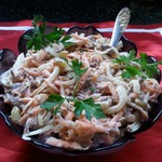 Это мой тоже любимый салат! И хотя на вид он может не такой красивый, как бывают, но очень вкусный - главное потоньше , нитями разобрать мясо на волокна, а это времени требует ( для меня