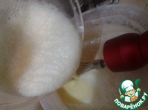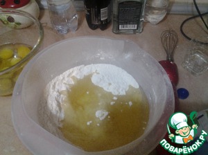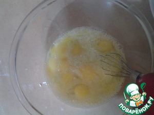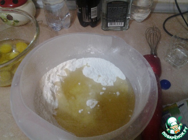 Кефир и молоко вводим в полученную массу частями, для предотвращения образования комков, хорошо взбиваем. Добавляем водку и ещё раз перемешиваем. Затем в тесто добавляем взбитые яйца.
