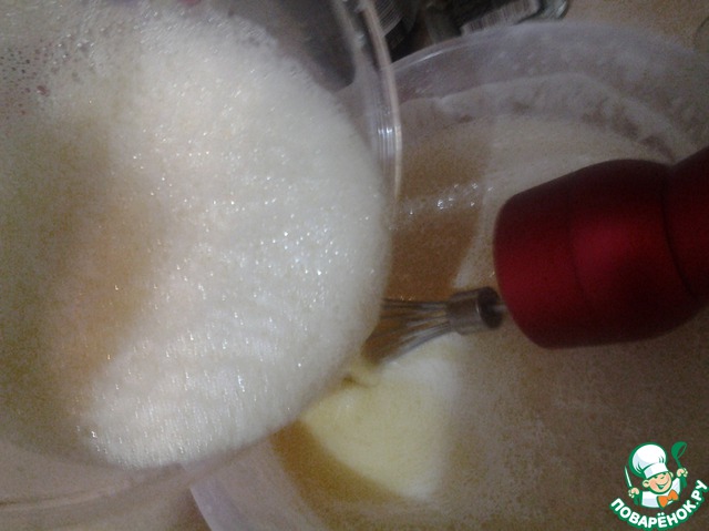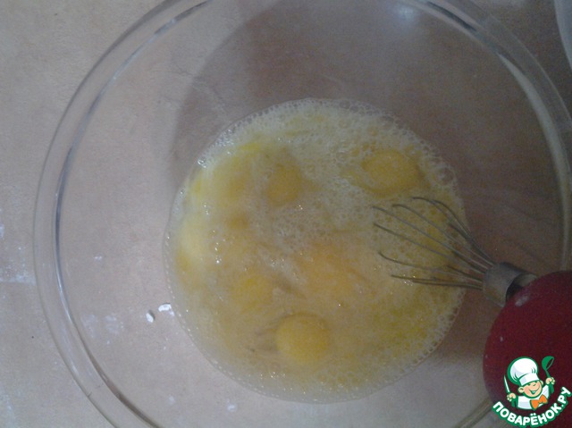 • Кефир и молоко вводим в полученную массу частями, для предотвращения образования комков, хорошо взбиваем. Добавляем водку и ещё раз перемешиваем. Затем в тесто добавляем взбитые яйца.