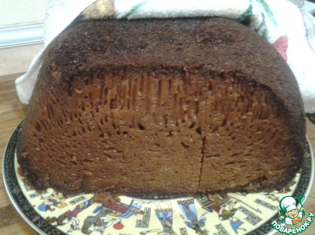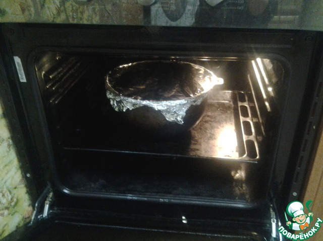 Вылить в казан тесто и закрыть его крышкой или фольгой. Ставим в духовку и первые 2 часа выпекаем при температуре 200 градусов. Затем убавляем температуру до 100 градусов и оставляем ещё на 1,5 часа.